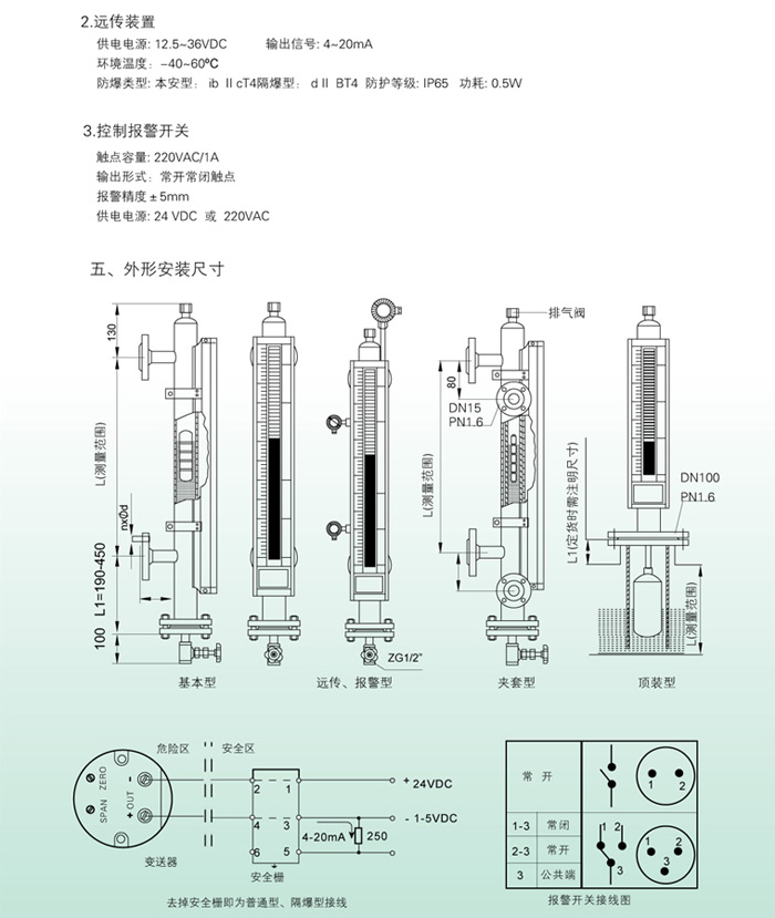 l 上下限開關輸出 利用磁性浮子隨液位移動,使安裝在液位計立管設定位置的簧片開關動作,實現(xiàn) ON-OFF 控制或報警。