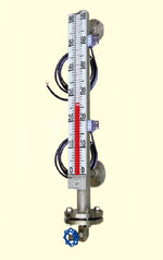 在您選用此產(chǎn)品前我們先將側(cè)裝式翻柱控制液位計的工作原理作一簡單的介紹:它有一容納浮球的腔體我們稱其為主體管或外殼,它通過法蘭或其他接口與容器組成一個連通器;這樣它腔體內(nèi)的液面與容器內(nèi)的液面是相同高度的,所以腔體內(nèi)的浮球會隨著容器內(nèi)液面的升降而升降;這時候我們并不能看到液位,所以我們在腔體的外面裝了一個翻柱顯示器,因為我們在制造浮球時在浮球沉入液體與浮出部分的交界處安裝了磁鋼,它與浮球隨液面升降時,它的磁性透過外殼傳遞給翻柱顯示器,推動磁翻柱翻轉(zhuǎn)180°;由于磁翻柱是有紅、白兩個半圓柱合成的圓柱體,所以翻轉(zhuǎn)180°后朝向翻柱顯示器外的會改變顏色(液面以下紅色、以上白色),兩色交界處即是液面的高度。