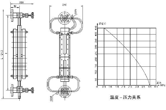 高溫玻璃板液位計的工作溫度與工作壓力成反比,最大工作溫度與最高工作壓力不能同時使用,見溫度與壓力曲線圖。